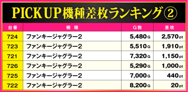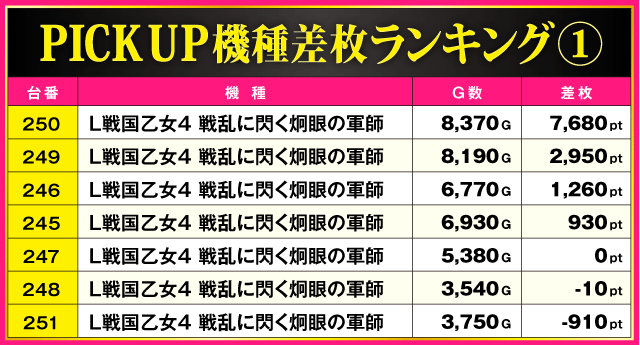 次にPICK UP機種の状況をチェックすると、ランキングトップになった『パチスロ かぐや様は告らせたい』は他にも+9,330ptが発生、『L戦国乙女4 戦乱に閃く炯眼の軍師』からは+7,680ptが飛び出している。また、『ファンキージャグラー2』は設置されている6台全てがプラス差枚で終了する見事な結果を残しファンを喜ばせていた。