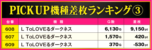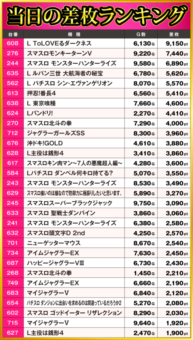 この日、最もプレイヤーの注目を集めたのが『L ToLOVEるダークネス』で、万枚目前の+9,150ptを叩き出しランキングトップに。その他の機種では『スマスロモンキーターンV』で+7,440pt、『スマスロ モンスターハンターライズ』で+6,890ptと、人気のスマスロを中心に好成績を多数確認できた。