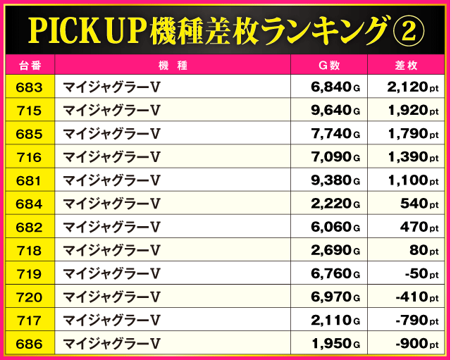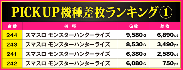 次にPICK UP機種をチェックしてみると、『スマスロ モンスターハンターライズ』はハイスコアを記録しただけではなく全台がプラス差枚となる見事な結果を残している。また、『マイジャグラーⅤ』は+2,120ptを筆頭に半数以上の台がプラス差枚と、ジャグラーシリーズならではの安定感を見せつけていた。