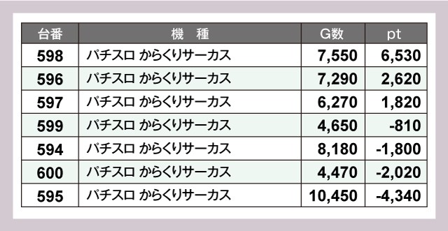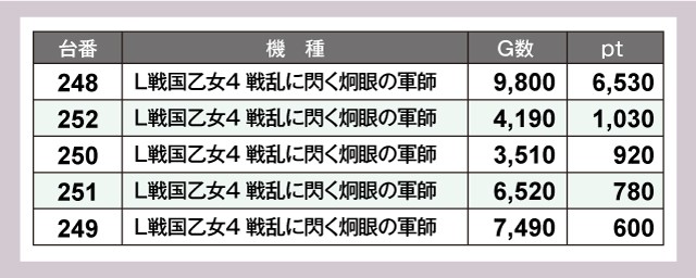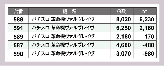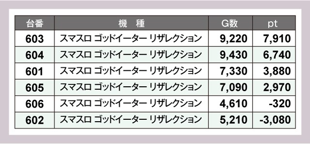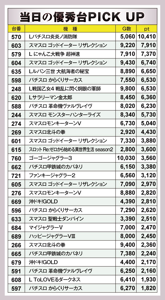 この日は570番台『Lパチスロ炎炎ノ消防隊』が1万ptオーバーを達成!さらに603番台『スマスロ ゴッドイーター リザレクション』や579番台『L にゃんこ大戦争 超神速』も+7,000ptオーバーと圧巻のパフォーマンスを披露している。