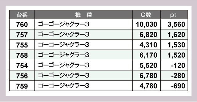 さらにAタイプの『ゴーゴージャグラー3』も好評で、なかには+3,000pt超の好調台も確認している。