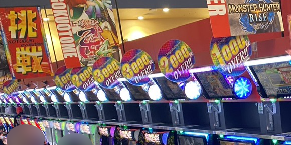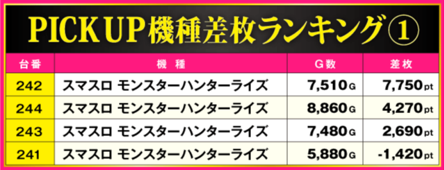 今回のPICK UP機種は全3機種。計19台のうち約半数の台がプラス差枚で終了する見事な結果を残している。なかでも『スマスロ モンスターハンターライズ』は、4台中3台がプラスとなっているだけに、シマ内は常に活気とファンの笑顔で溢れ返っていたのが印象的であった。