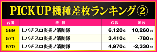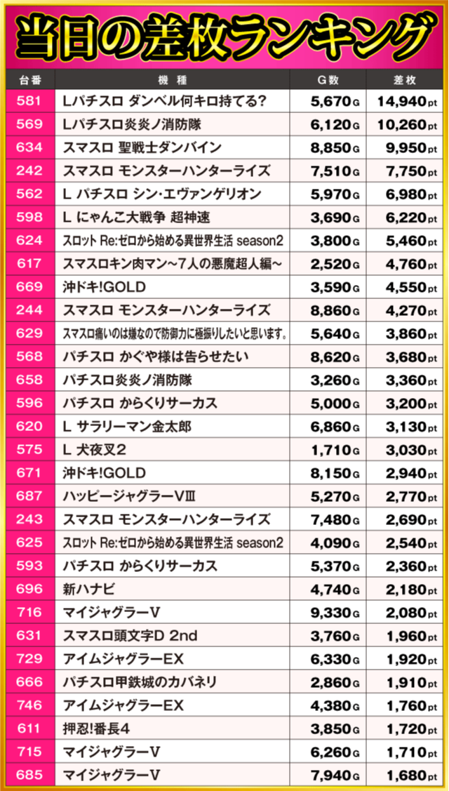 この日は、『Lパチスロ ダンベル何キロ持てる?』で+14,940pt、『Lパチスロ炎炎ノ消防隊』で+10,260ptが飛び出しプレイヤーの注目を集めていた。また、その他の機種では『スマスロ 聖戦士ダンバイン』で+9,790pt、『スマスロ モンスターハンターライズ』で+7,750ptと、様々な機種からハイスコアが続出している。