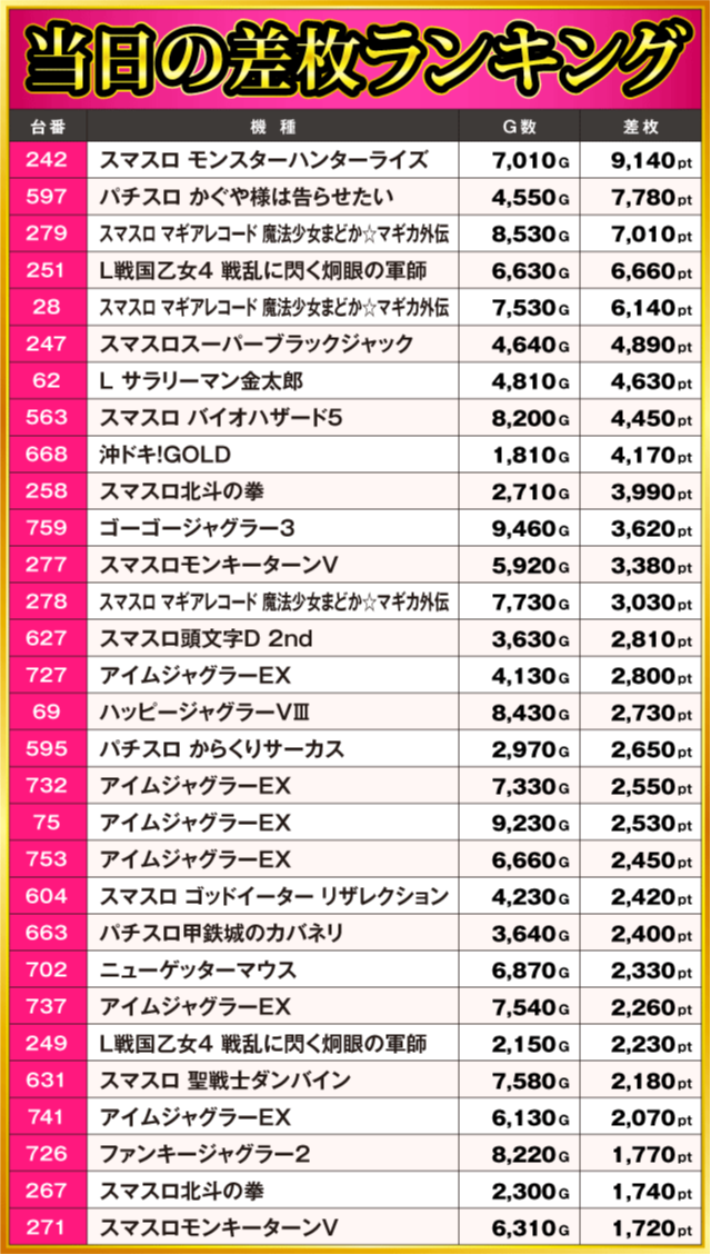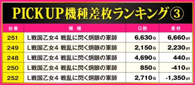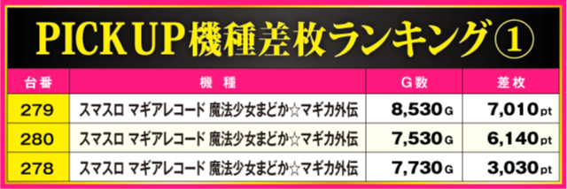 今回のPICK UP機種を全3機種。差枚ランキングで上位に入った『スマスロ マギアレコード 魔法少女まどか☆マギカ外伝』は、設置されている3台全てがプラス差枚となる見事な結果に。また、『L戦国乙女4 戦乱に閃く炯眼の軍師』から+6,660pt、『ゴーゴージャグラー3』から+3,620ptが確認されている。