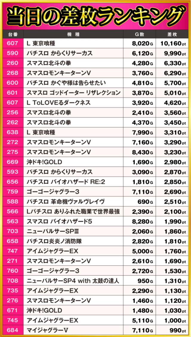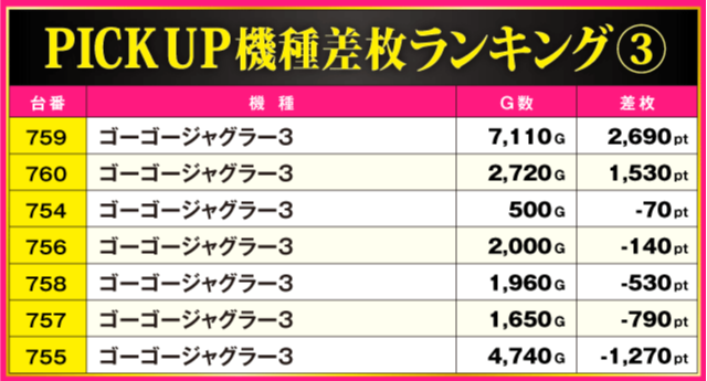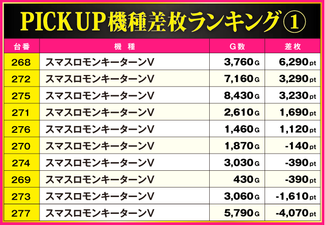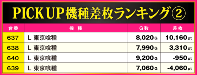 今回のPICK UP機種を全3機種。なかでも『スマスロモンキーターンV』からハイスコアが続出しており、268番台の+6,290ptを筆頭に半数の台がプラス差枚となっている。また、『L 東京喰種』は万枚超以外に+3,310pt、『ゴーゴージャグラー3』からは+2,690ptが発生し店内を盛り上げていた。