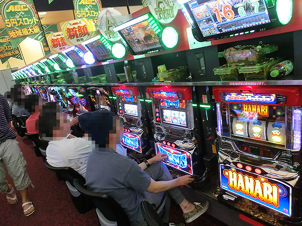5円パチスロではボーナスタイプのシマが活況な様子。「ハナビ」で機種性能を最大限に引き出したプレイヤーは、周囲から羨望を集めていた。