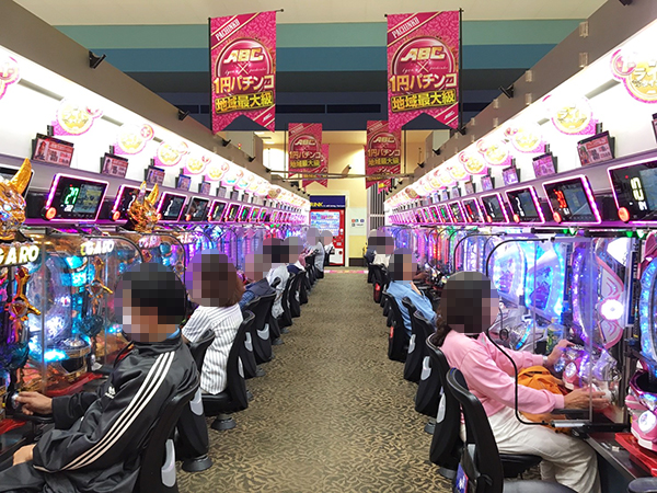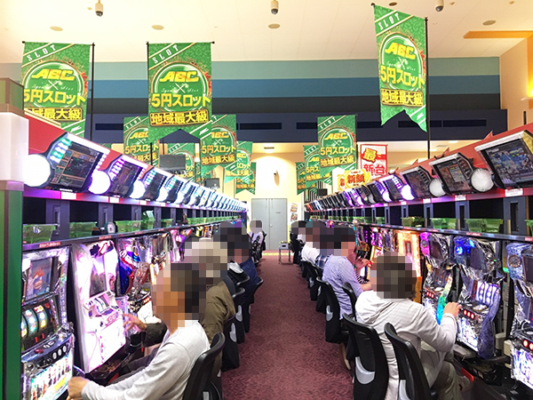 同店はパチンコ480台・パチスロ320台・総設置台数800台を誇る大型店舗。取材当日は強い雨が降っていたが、店内では多くのプレイヤーでにぎわっていた。