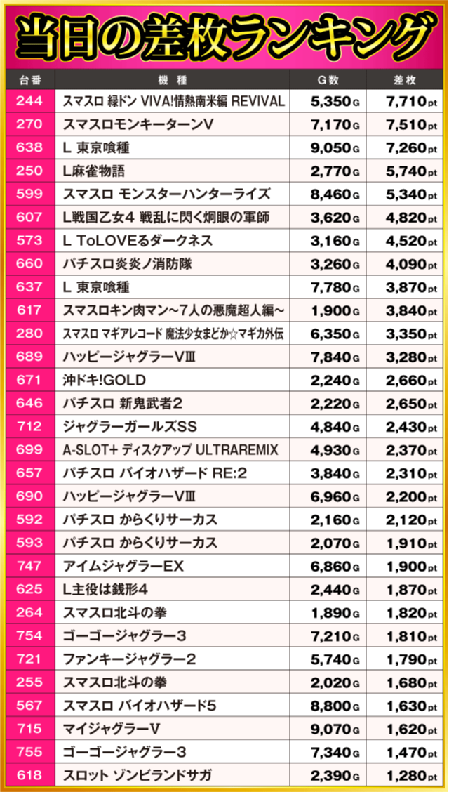 当日の差枚ランキング