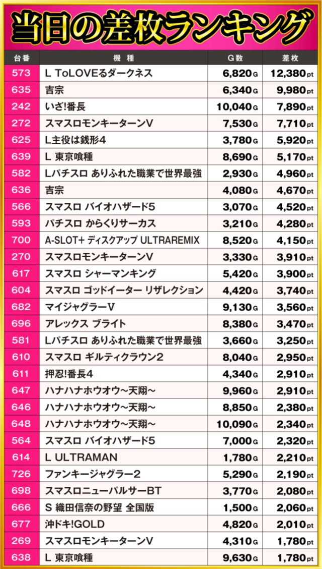 当日の差枚ランキング