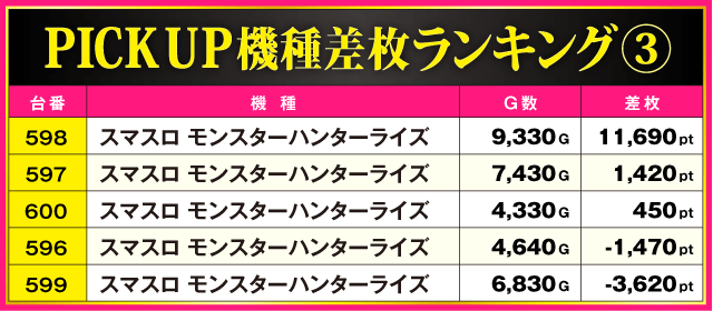 次にPICK UP機種の状況を見ていこう。2つの炎炎ノ消防隊シリーズは、両機種合わせた全8台中6台、万枚超が飛び出した『スマスロ モンスターハンターライズ』は全5台中3台がプラス差枚となっているだけに、それぞれのシマは常に活気とファンの笑顔に溢れる一日となった。