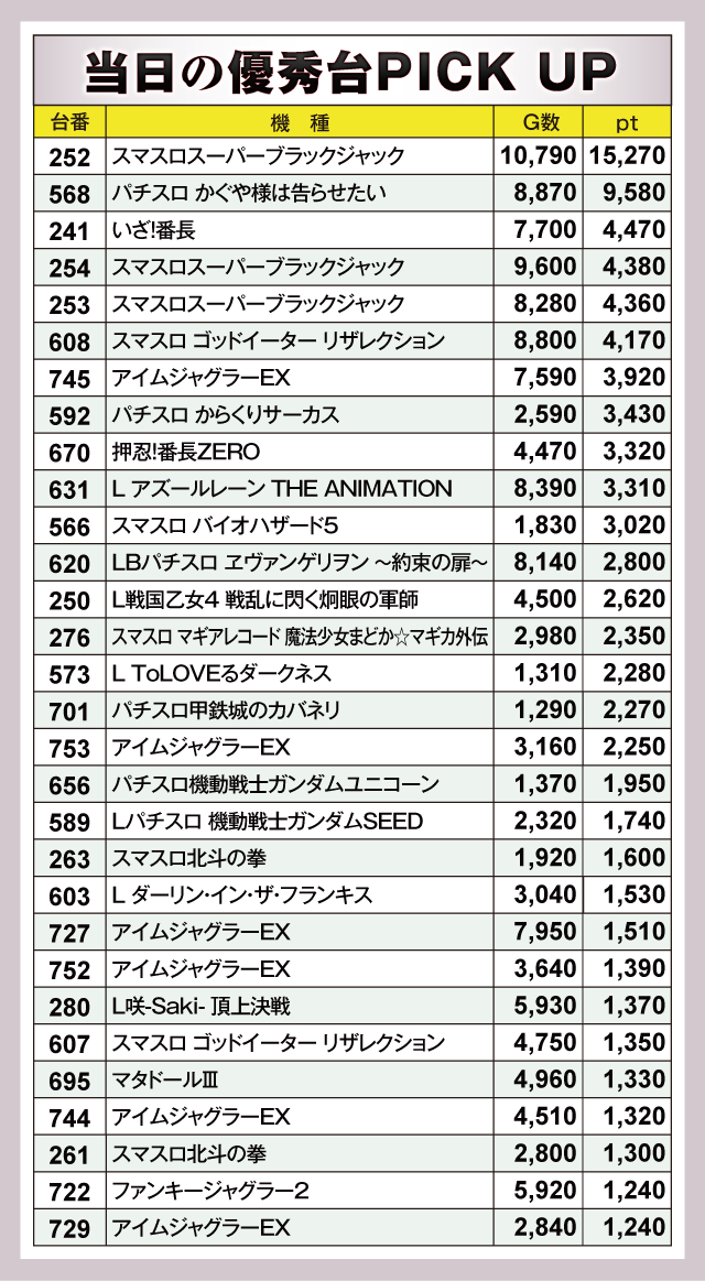 圧倒的な存在感を示したのは『スマスロスーパーブラックジャック』。252番台が+15,270ptと飛びぬけた成績をおさめていた。次いで『パチスロ かぐや様は告らせたい』568番台が+9,580ptと好結果。以下にも『いざ!番長』241番台の+4,470pt、『スマスロスーパーブラックジャック』の254番台が+4,380pt、253番台が+4,360ptとプレイヤーの充実した遊技がうかがえた。