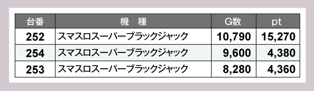 上でもふれた『スマスロスーパーブラックジャック』は設置3台すべてが大幅プラスpt。いずれもかなりの高稼働で、252番台にいたっては1万回転超えを達成している。