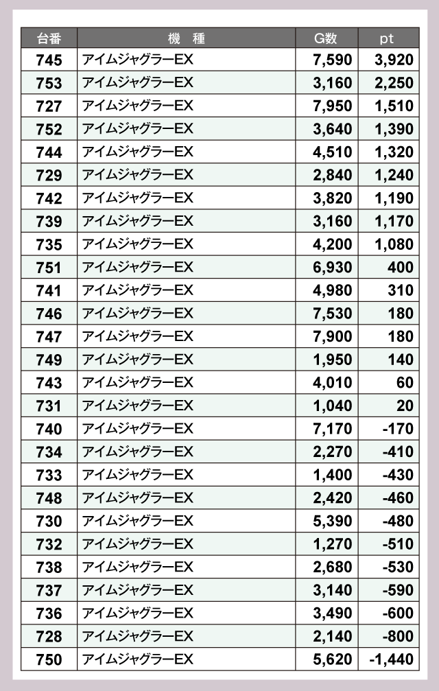 大量設置の『アイムジャグラーEX』は16台がプラスptで、メイン機種としての人気ぶりを発揮していた。