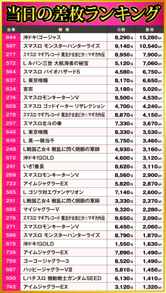 当日の差枚ランキング