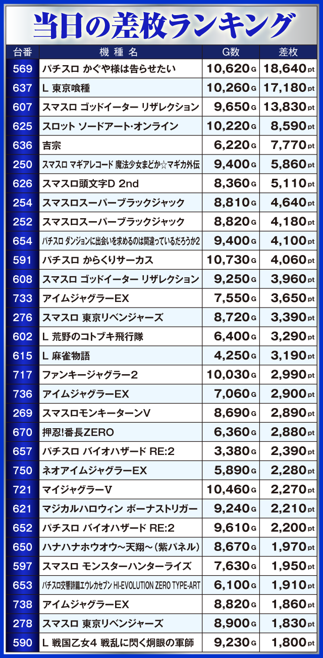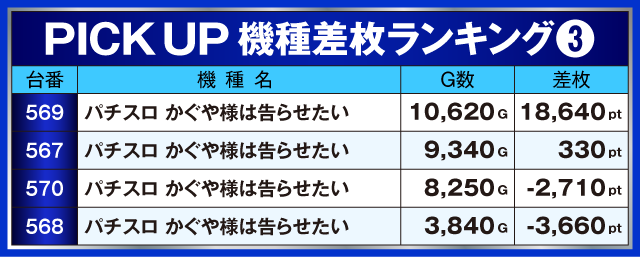 『パチスロ かぐや様は告らせたい』569番台が+18,640ptと、驚異的な成績でトップに輝いた。そして『L 東京喰種』637番台が+17,180pt、『スマスロ ゴッドイーター リザレクション』607番台が+13,830ptと1万ptオーバーでつづく。さらに『スロット ソードアート・オンライン』625番台の+8,590pt、『吉宗』636番台の+7,770ptなどなど、誰もがうらやむ好結果が並ぶ見事なランキングとなっていた。