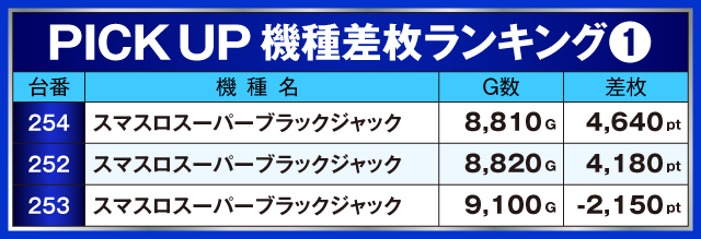 『スマスロスーパーブラックジャック』は全台が高稼働で、そのうち2台が4,000ptオーバーと好成績を残している。