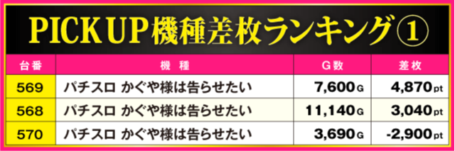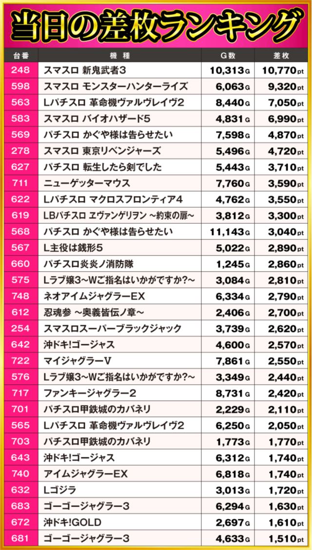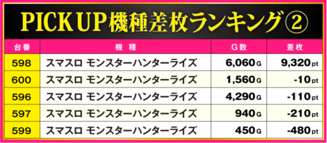 今回のPICK UP機種は全3機種で、差枚上位にランクインした『スマスロ 新鬼武者3』と『スマスロ モンスターハンターライズ』以外にも『パチスロ かぐや様は告らせたい』から+4,870ptが発生。さらに、最終的に3機種トータルの全12台のうち半数ちかくの台がプラス差枚となる見事な結果を残している。