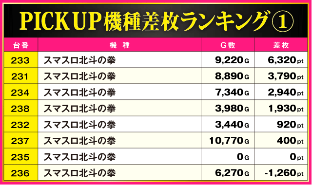 今回のPICK UP機種は『スマスロ北斗の拳』。差枚上位にランクインした233番台以外にも+3,790ptや+2,940ptといった好成績が確認されている。しかも、最終的にプラス域に届かなかったのはわずか1台という見事な結果を残しているだけに、ファンにとって充実の一日となったのは間違いないだろう。