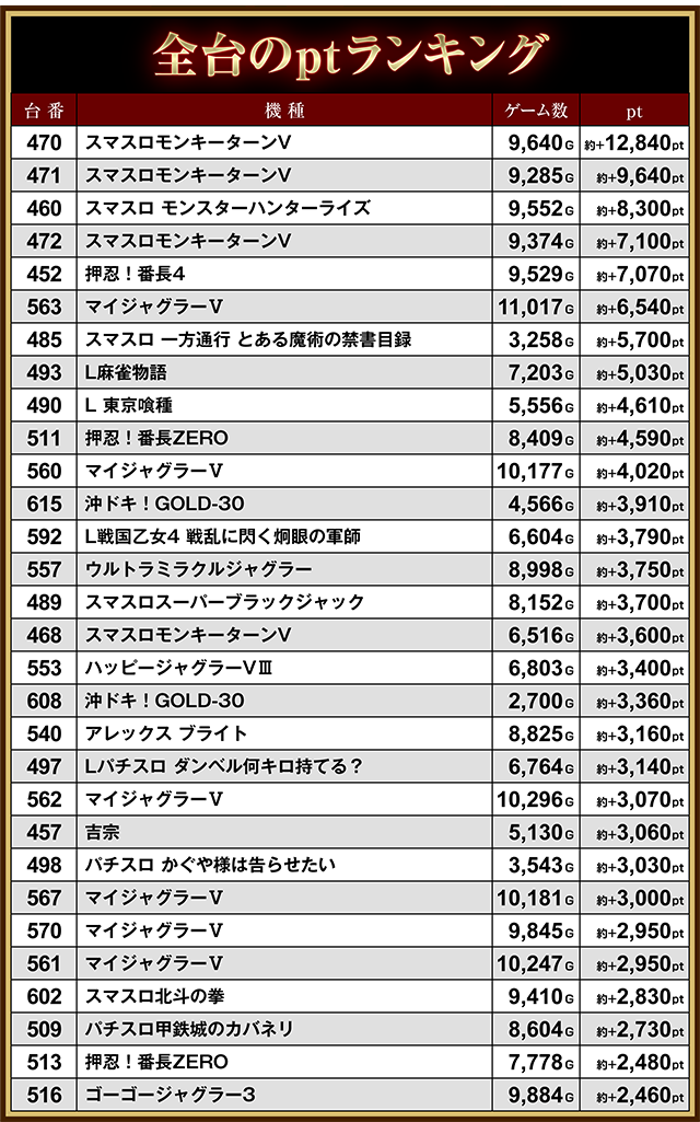 「押忍!番長4」の452番台も約+7,070ptと、多くの台に活気があった。