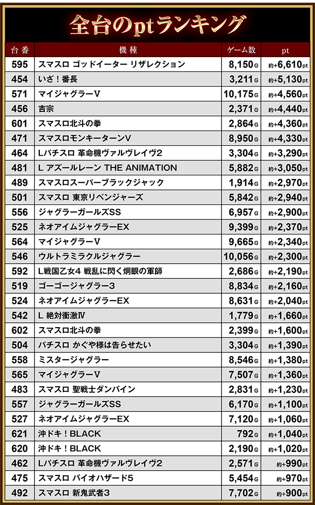 ほかにも、「吉宗」の456番台や「スマスロ北斗の拳」の601番台、「スマスロモンキーターンV」の471番台が約+4,300pt以上となった。