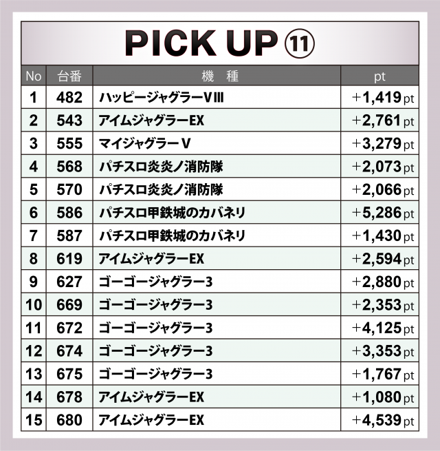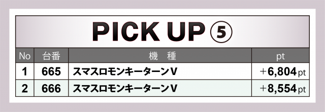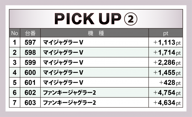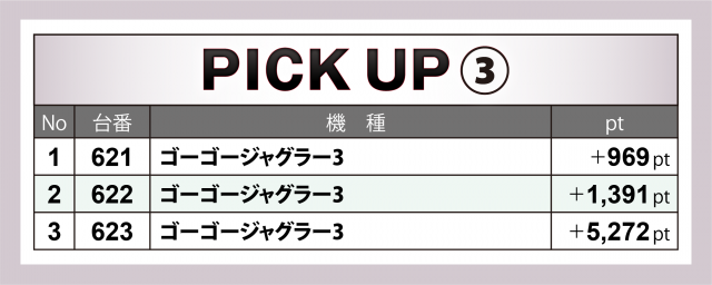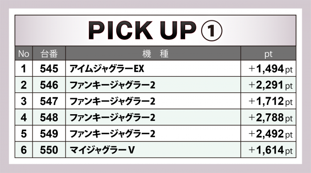 同じ機種だけではなく、シリーズを跨ぎ塊でのプラスを達成しており、『ゴーゴージャグラー3』623番台の+5千3百弱を筆頭に『ファンキージャグラー2』では+4千超が2台続くなど、そこかしこで盛り上がりが認められた。