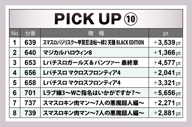ここからは[1000円/46枚]スロ全216台の中で躍進した台をピックアップ。特に触れたいのは2~7台横並びでの好況。ジャンル別に続々と見ていこう。