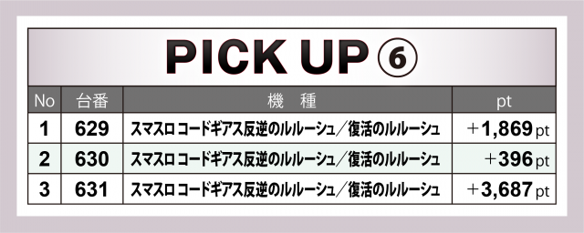 その他、『スマスロ コードギアス反逆のルルーシュ/復活のルルーシュ』も3台揃ってプラス。中でも631番台が+3千7百弱で機種トップを果たした。