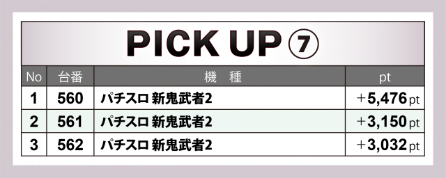『パチスロ 新鬼武者2』は3台続きでいずれも+3千超を達成、560番台が+5千5百弱と最優秀に輝いた。