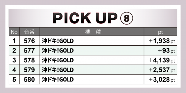 『沖ドキ!GOLD』は設置6台のうち5台が一直線でプラスを成立、+4千超・+3千超・+2千超が1台ずつと、こちらも盛況となった。