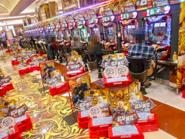 14時ごろの4円パチンコの様子を見ると「ぱちんこCR真・北斗無双」や「CR大海物語4」が大盛り上がり。理想的な展開を迎えたプレイヤーを目の当たりにしている。