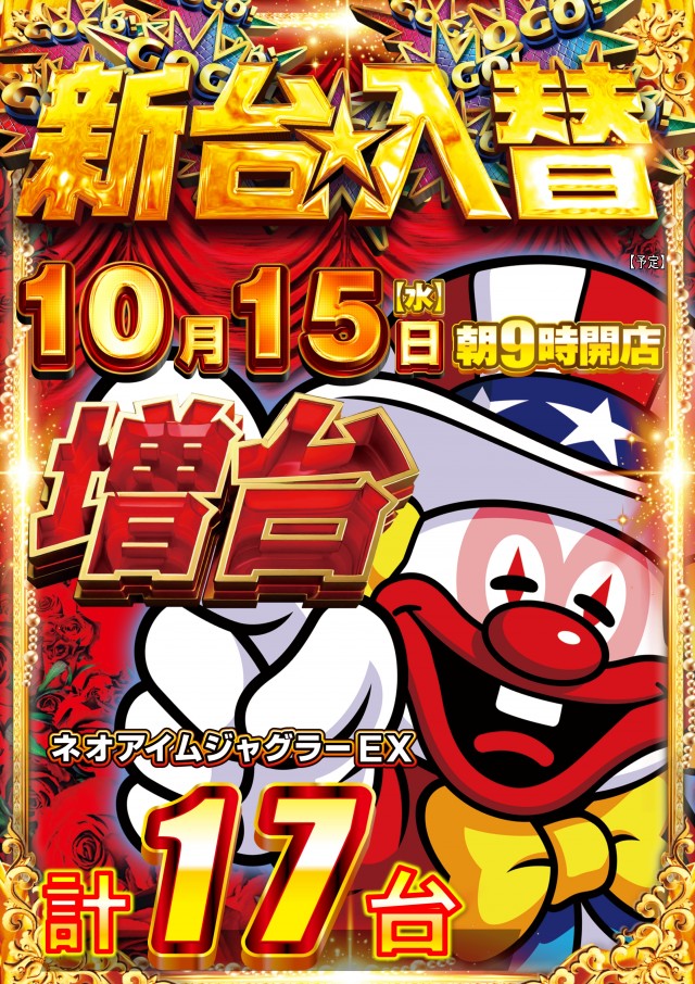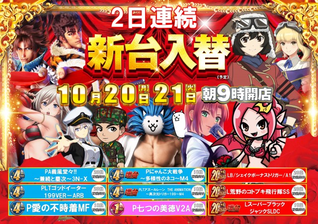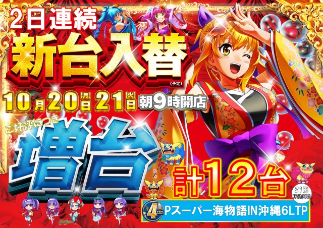 明日10/20(月)★2日間連続新台入替(予定)&周年月間★