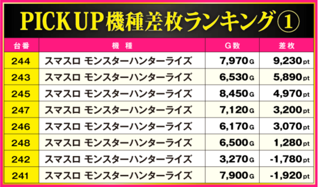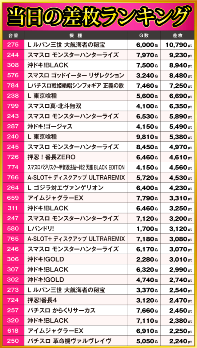 この日、最もプレイヤーの注目を集めたのが『Lルパン三世 大航海者の秘宝』で、万枚超の+10,790ptを叩き出しランキングトップに。次いで『スマスロ モンスターハンターライズ』で+9,230pt、『沖ドキ!BLACK』と『スマスロ ゴッドイーター リザレクション』で+8,000pt超と、人気機種を中心にハイスコアが続出していた。
