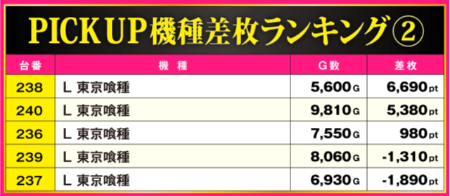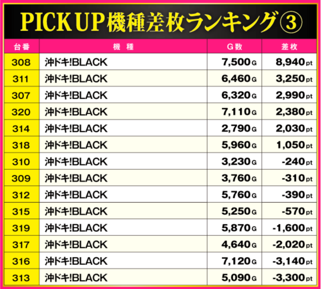 今回のPICK UP機種は全3機種。なかでも、地域最大級を誇る『沖ドキ!シリーズ』の一つである『沖ドキ!BLACK』は、ランキング上位台以外にも+2,000pt超が4台も発生する盛況ぶりを見せている。さらに、『スマスロ モンスターハンターライズ』は全8台中6台、『L 東京喰種』は全5台中3台がプラス差枚となる見事な結果を残しファンを喜ばせていた。