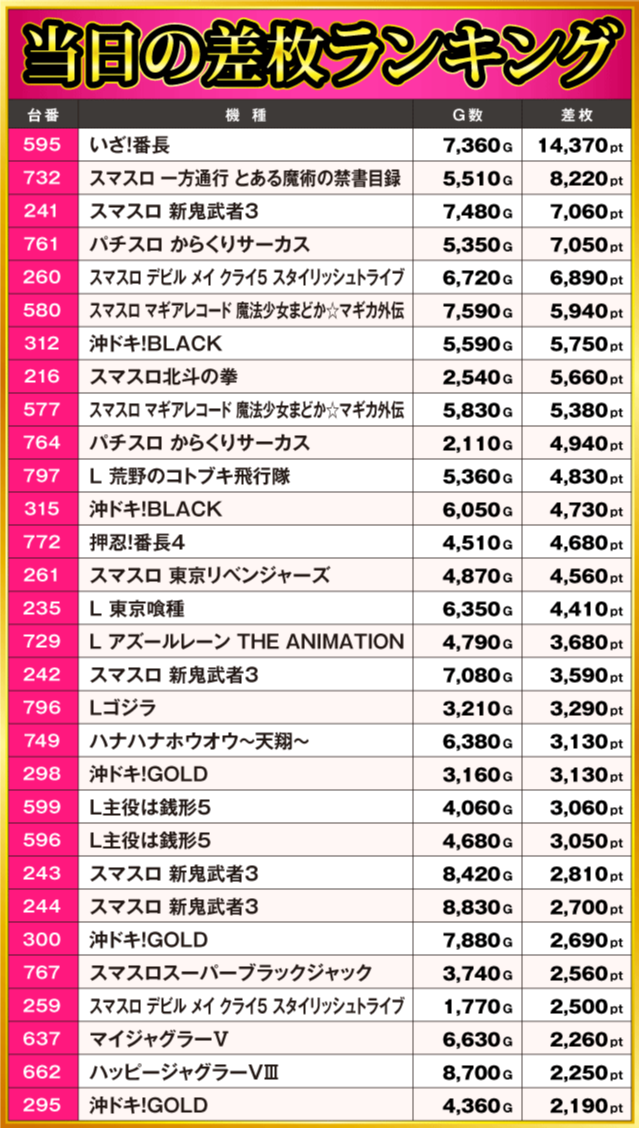 この日は、地域最大級の沖ドキ!シリーズをはじめ、人気の『スマスロ 新鬼武者3』や『スマスロ マギアレコード 魔法少女まどか☆マギカ外伝』を中心に多数の好調台を確認。そんな中、『いざ!番長』が怒涛の+14,370ptを叩き出しランキングトップに。次いで『スマスロ 一方通行 とある魔術の禁書目録』が+8,220ptを記録している。