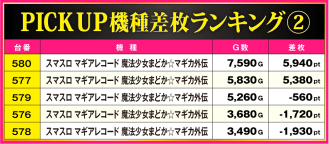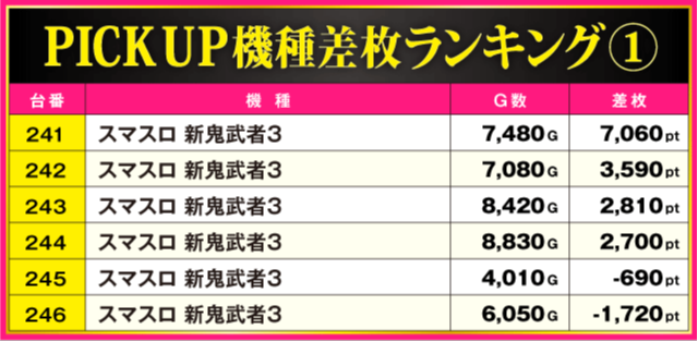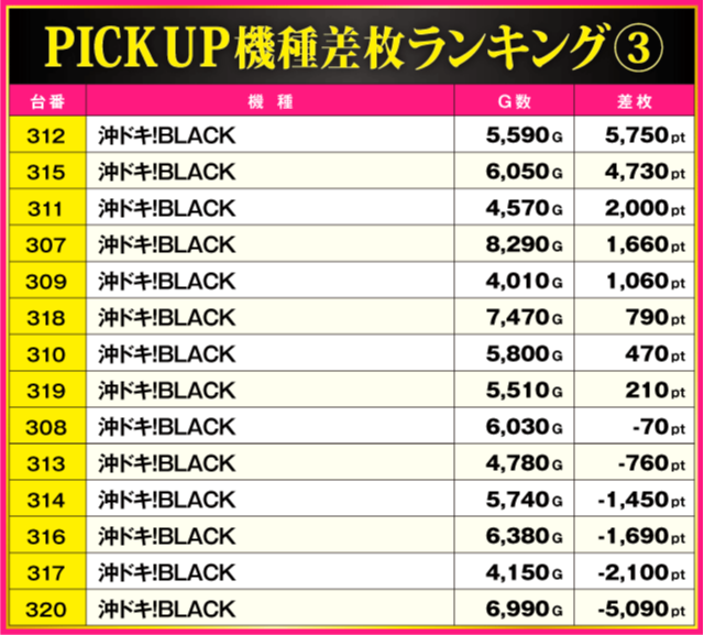 次にPICK UP機種の状況をチェックしていくと、『スマスロ 新鬼武者3』から+7,060pt、『スマスロ マギアレコード 魔法少女まどか☆マギカ外伝』からは+5,000pt超が2台も発生。さらに、看板機種の一つである『沖ドキ!BLACK』は312番台の+5,750ptを筆頭に半数以上の台がプラス差枚となる見事な結果を残している。