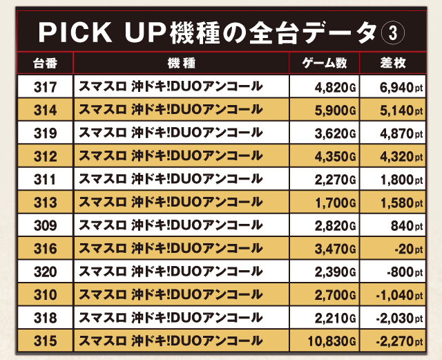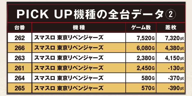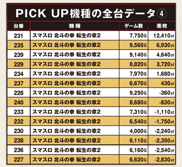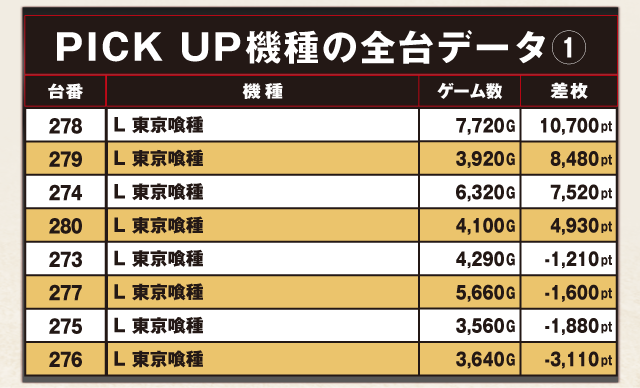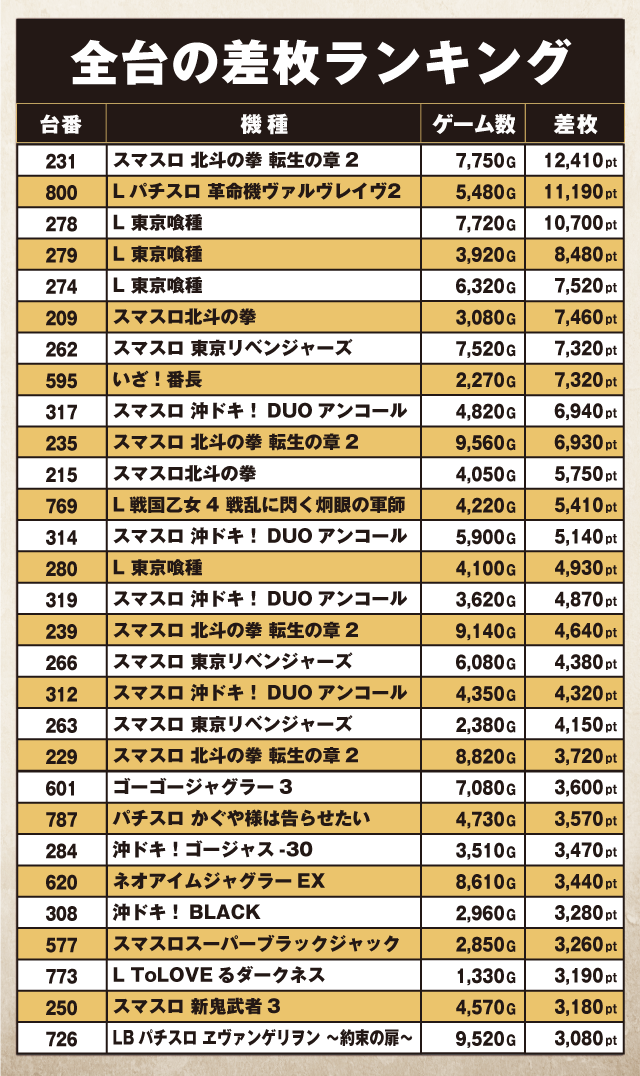 『スマスロ 北斗の拳 転生の章2』231番台が+12,410ptでトップに輝き、『Lパチスロ 革命機ヴァルヴレイヴ2』800番台が+11,190ptでつづく。そして『L 東京喰種』278番台が+10,700pt、279番台が+8,480pt、274番台が+7,520ptと3台連続でランクイン。以下『スマスロ北斗の拳』209番台の+7,460ptなど、誰もがうらやむようなptがズラリと並んでいた。