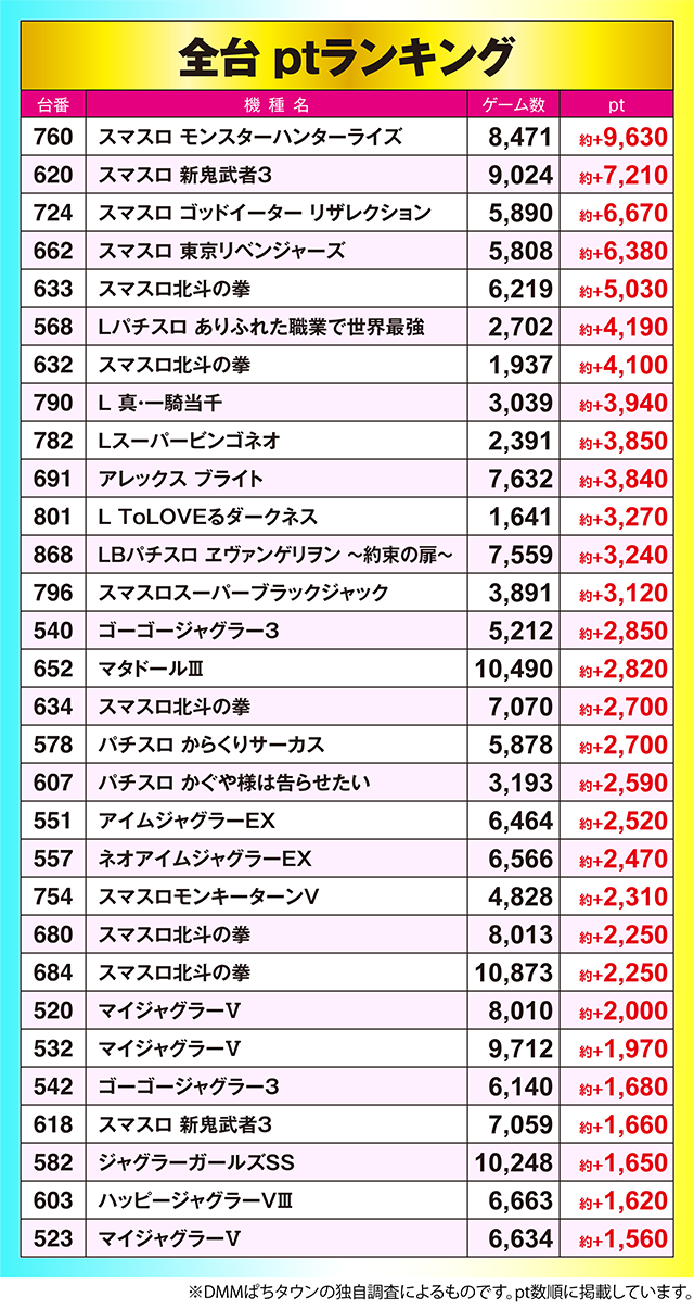 最新機種では、「スマスロ 新鬼武者3」の620番台が約+7,210ptを記録した。