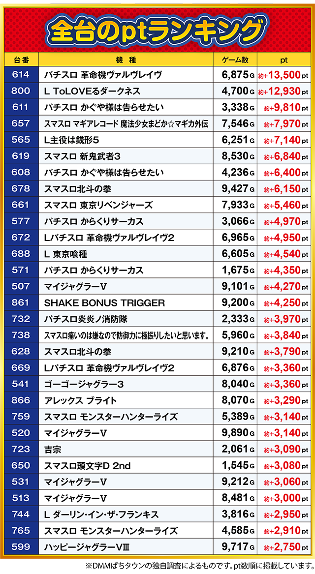 「PaPaOne」では、「パチスロ 革命機ヴァルヴレイヴ」の561番台が約+6,700ptオーバー。