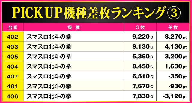 続いて、PICK UP機種をチェックしてみると、お店の看板コーナーであるマンガン店長のバラエティが絶好調!! ランキングトップの『L ゴジラ対エヴァンゲリオン』以外にも+5,000pt超が3台も発生している上に、全18台中11台がプラス差枚で終了する見事な結果を残している。