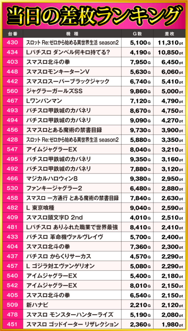 この日は、様々な機種で好調台を多数確認。そんな中、『スロット Re:ゼロから始める異世界生活 season2』と『Lパチスロ ダンベル何キロ持てる?』が万枚超を達成しプレイヤーの注目を集めていた。次いで、『スマスロ北斗の拳』と『スマスロモンキーターンV』が+6,000pt超を記録している。