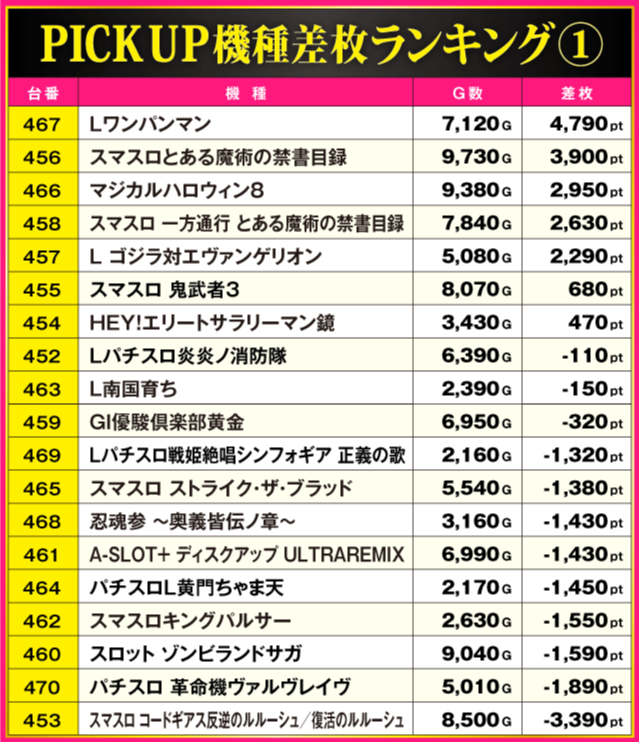 続いてPICK UP機種の状況をチェックしてみよう。同店の看板コーナーである「マンガンバラエティ」は、『Lワンパンマン』の+4,790ptをはじめ+2,000pt超の台が複数発生。また、『パチスロ甲鉄城のカバネリ』は全6台中5台がプラス差枚で終了しているだけに、ファンにとっては充実の一日になったと言えるだろう。