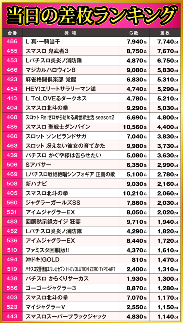 この日は、様々な機種で好調台を多数確認。そんな中、『L 真・一騎当千』と『スマスロ 鬼武者3』から+7,000pt超が飛び出しプレイヤーの注目を集めていた。また、ジャグラーシリーズも奮闘しており、『ジャグラーガールズSS』と『アイムジャグラーEX』の+2,000pt超をはじめ複数のシリーズがランクインしている。