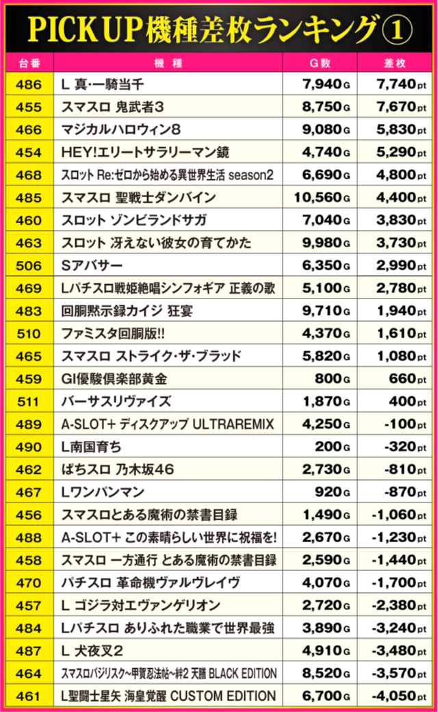 続いてPICK UP機種の状況をチェックしてみよう。今回も、同店の看板コーナーである「マンガンバラエティ」から数々のハイスコアを確認。『HEY!エリートサラリーマン鏡』や『マジカルハロウィン8』が+5,000pt超を記録するなど、長期稼働している機種がしっかりと結果を残している点は注目すべきポイントと言えるだろう。