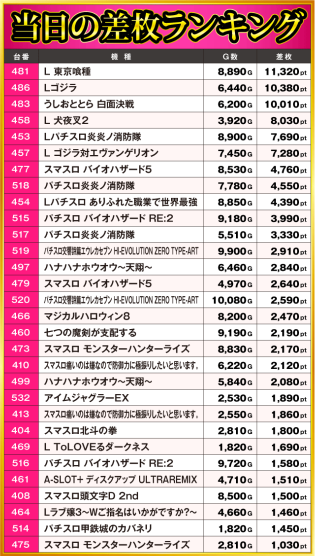 当日の差枚ランキング