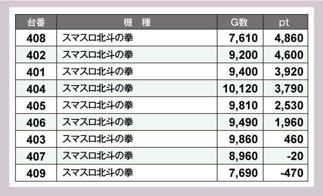 『スマスロ北斗の拳』では9台中7台がプラスで、そのうち6台が+1,000ptオーバーと見事な内容だった。