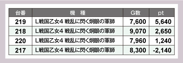 『スマスロ モンスターハンターライズ』や『L戦国乙女4 戦乱に閃く炯眼の軍師』、『吉宗』といったスマスロが+5,000ptオーバーを達成し、スロットコーナーを大いに盛り上げていた。