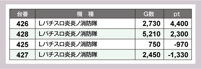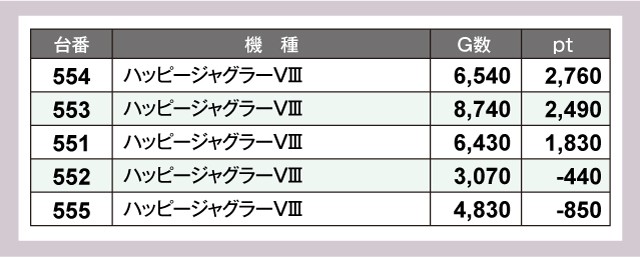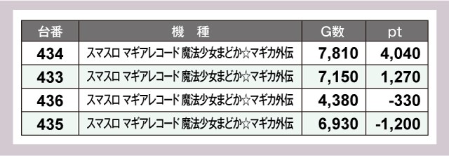 『ハッピージャグラーVⅢ』や『Lパチスロ炎炎ノ消防隊』、『スマスロ マギアレコード 魔法少女まどか☆マギカ外伝』からも4桁pt超の優秀台が複数誕生しており、プレイヤーたちは充実した時間を過ごせていたように思う。