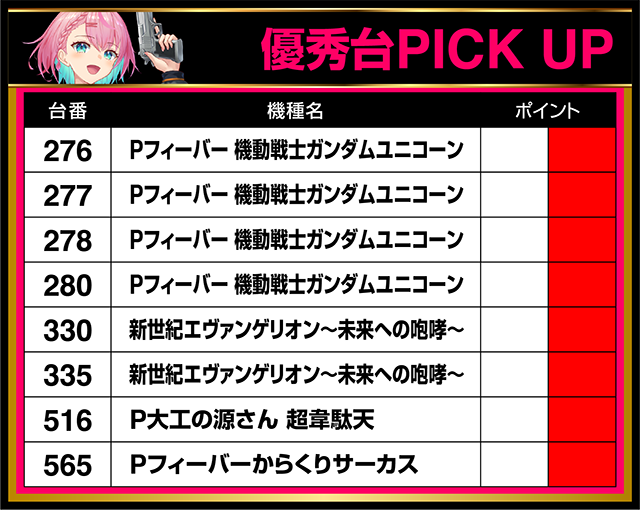 「Pフィーバー 機動戦士ガンダムユニコーン」はすべての台が好結果を残し、なかでも目をひかれたのは278番台だ。