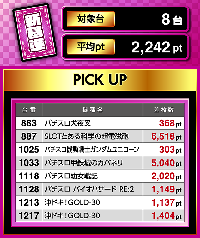 新基準は、887番台の「SLOTとある科学の超電磁砲」が6,000pt超。