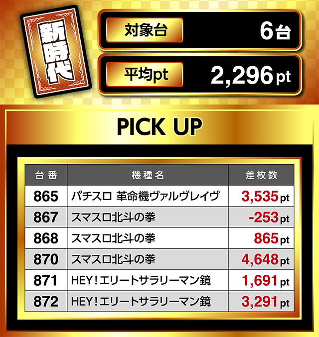 新時代は、「スマスロ北斗の拳」の870番台が4,600ptオーバー。